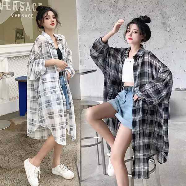 シアーシャツ チェック柄 長袖 シャツ・ブラウス レディース ファッション 可愛い 透け感 シンプル 膝上 折り襟 ボタンシャツ・ブラウス 韓国系 カジュアル 韓国 オーバーサイズ 羽織り UV対策 冷房対策 体型カバー トップス 春 夏 秋 大きいサイズ ゆったり 韓国 k6093zb
