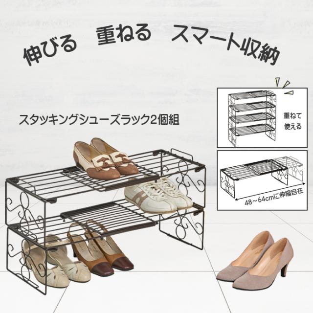 【狭い玄関も有効活用!】2個セット シューズラック スリム 省スペース 狭い玄関 2段 おしゃれ 積み重ね可能 伸縮可能 玄関収納 シューズボックス 靴棚 靴箱 / スタッキングシューズラック2個組