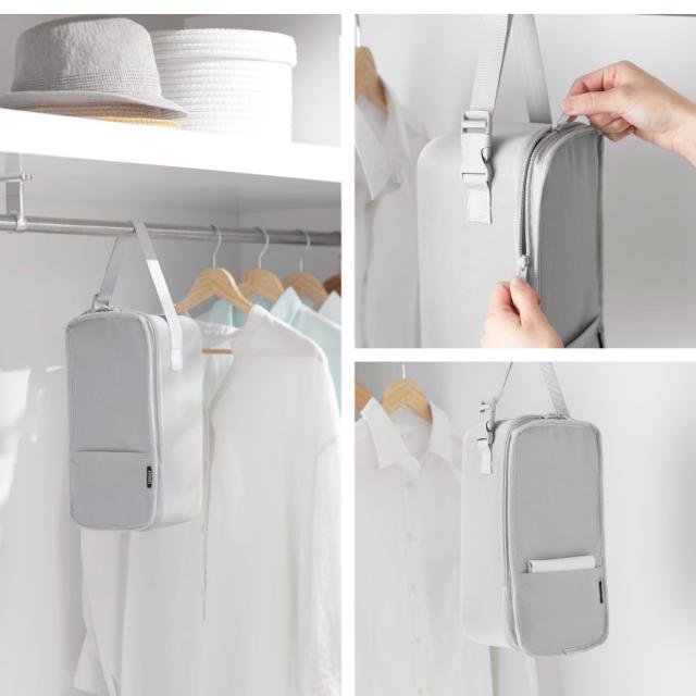 調節可能なバックル付きベルトでハンガーバーやクローゼットに吊り下げて収納することができます。