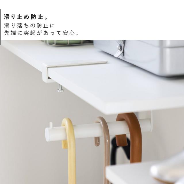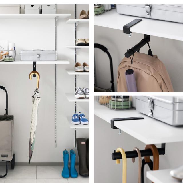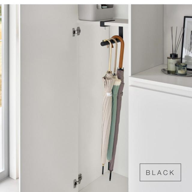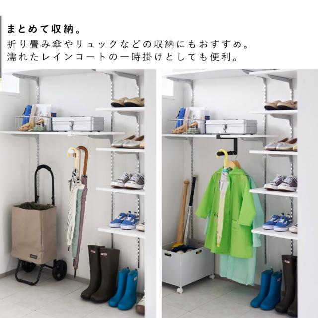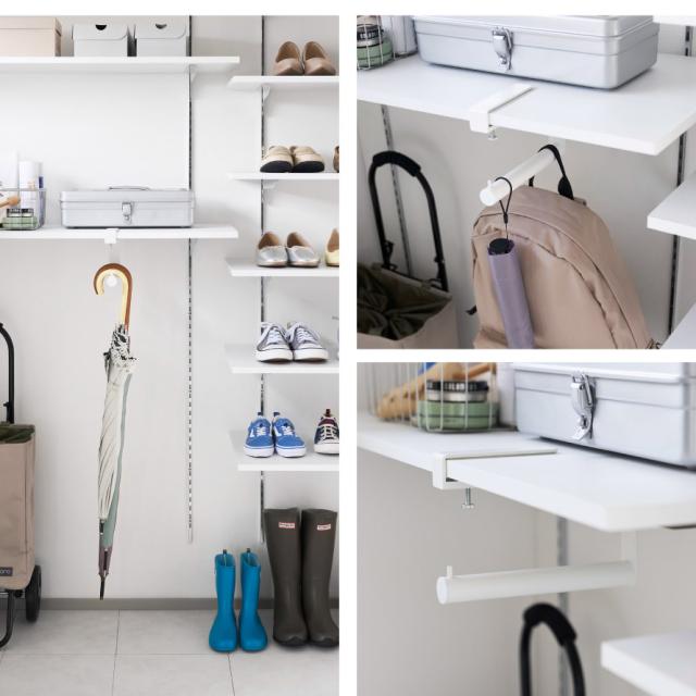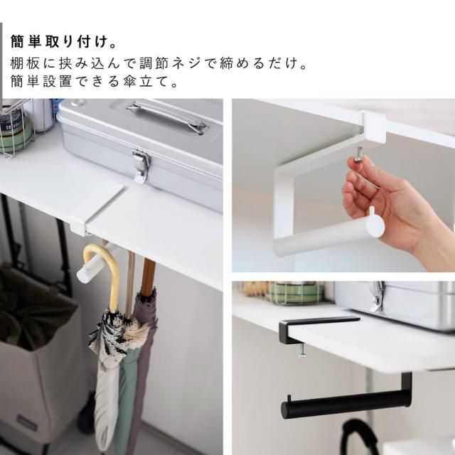 長傘をシューズクロークや下駄箱に収納して玄関をスッキリ。棚板に挟み込んで調節ネジで締めるだけの簡単設置できる傘立て。折り畳み傘やリュックなどの収納にもおすすめ。濡れたレインコートの一時掛けとしても便利です。