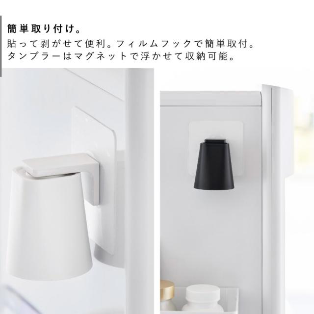 フィルムフックでお好みの位置に簡単取付。マグネットで浮かせて収納できるマウスウォッシュタンブラー。水に強く目立ちにくい貼って剥がせるフィルムフックで、お好きな場所に簡単設置。デッドスペースを有効利用できます。