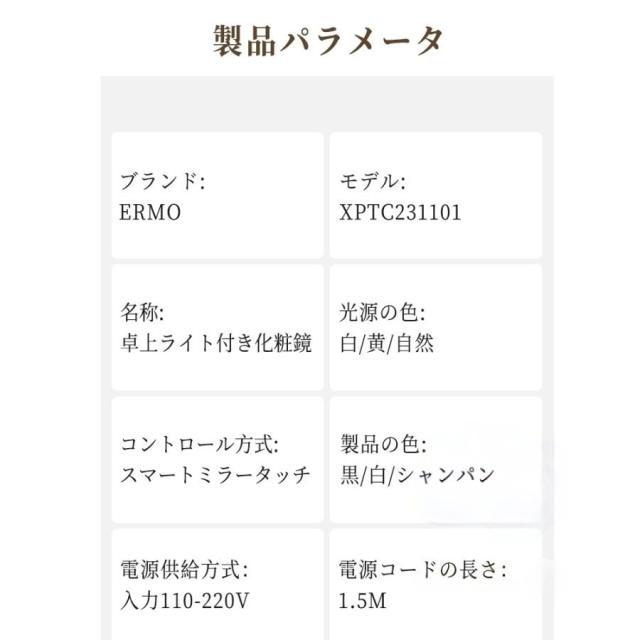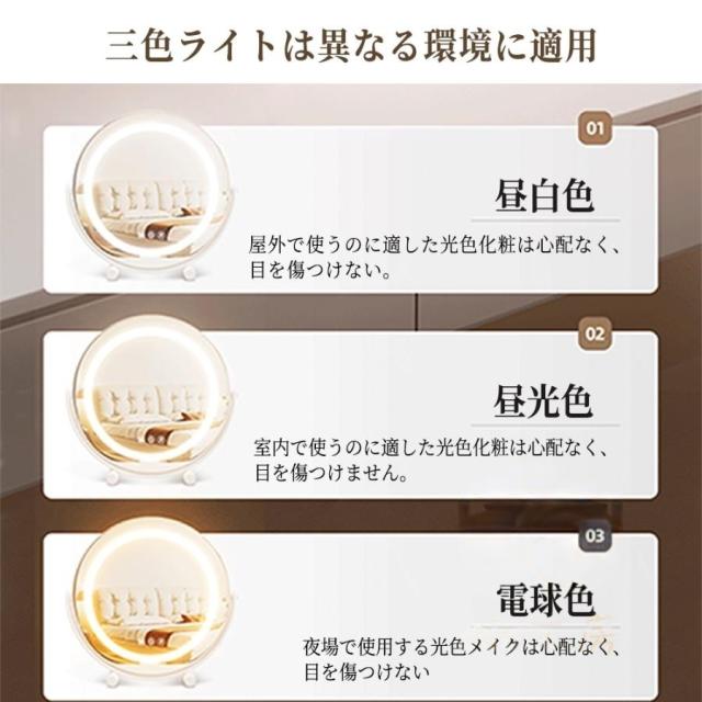 暖かい光、涼しい光、自然な光の3つのモードがあり、あらゆるシーンでメイクを楽しめます。昼、夜、自宅、オフィスなどの環境を簡単に切り替えて、すべての照明条件でメイクアップの正しい外観を確認できます。パーソナルメイクのニーズに応えます。