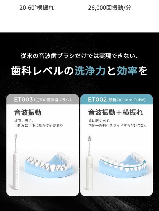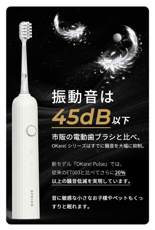 【予約販売★4月上旬入荷予定】電動歯ブラシ EPEIOS OKare! Pulse ET002 二重の振動 歯間ケア 60°横振れ 電動歯磨き 45日間長持ち IPX7防水 超静音 2分間タイマー 超音波電動歯ブラシ USB充電 歯垢除去 デンタルケア ホワイトクリーン 子供 おしゃれ