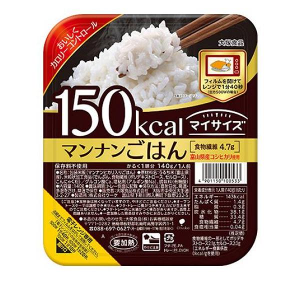 ●大塚食品 150kcal MY SiZE(150キロカロリーマイサイズ)マンナンごはん●健康は、計算できる。おいしく続けられるカロリーコントロール。●150kcalのマンナンご飯。●別売のマイサイズソースと合わせればトレーがそのままお皿代わりに!●フィルムをはがし、パックごとレンジで調理。●富山県産コシヒカリとマンナンヒカリを使用。食物繊維4.7g。●保存料、合成着色料不使用のパックご飯。●名称:包装米飯(マンナンヒカリ入りごはん)