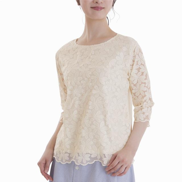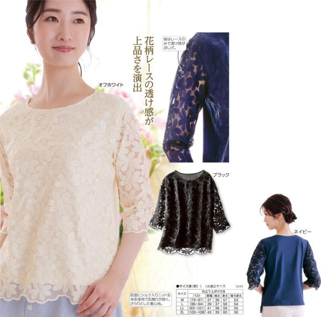 シルク混花柄レース7分袖Tシャツ