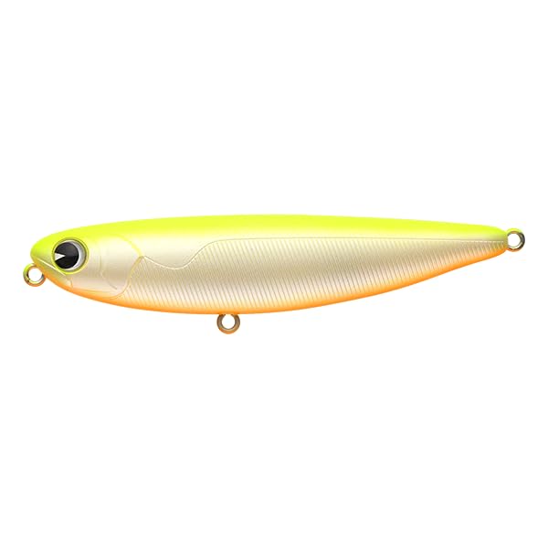 シーバスのウォーターゲームで頻発するミスバイト対策として、フッキング率を向上させるために浮力をギリギリまで落とし【吸い込みを重視したペンシルベイト】です。 アングラーのロッドアクションに機敏に反応し、真横90度近くにグイッと首を鋭く振る動きはシーバスのバイトを誘発します。