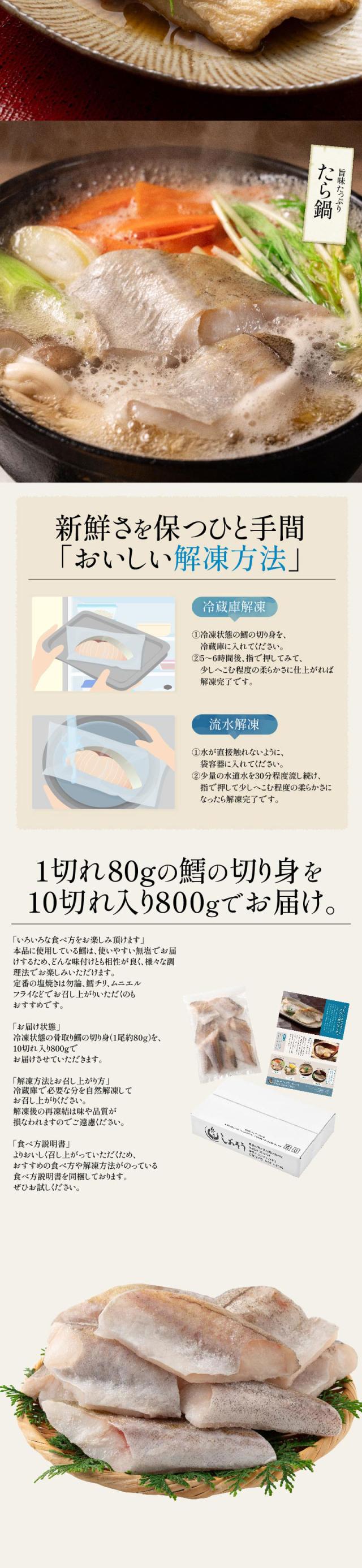 【無添加・無塩】プレミアム 骨取り タラ 鱈 切り身 大サイズ (80g×10切) 2個購入500円 3個購入1,200円 OFF まとめ買いクーポン付 天然 骨なし スケソウダラ 助宗鱈 チャック袋 バラ凍結 冷凍 グルメ ギフト プレゼント お歳暮