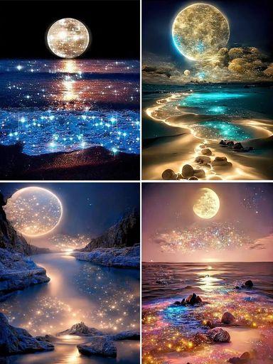 【5 Dダイヤモンドアート キット】月 4個セット 四角いビーズ ダイヤモンドアートには必要なすべてのツールが付属しています。高精細日本語キャンバスx4枚、ダイヤモンドペンx4本、粘土糊x4個(2x2cm)、ビーズトレイx4個、ビーズ収納バッグ 4x4枚(合計16枚)、カラフルな四角いビーズx4 を含むる。ダイヤモンド スクエア ビーズの不足を避けるために、ビーズの数を30%増やします。