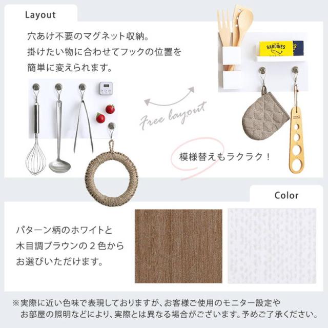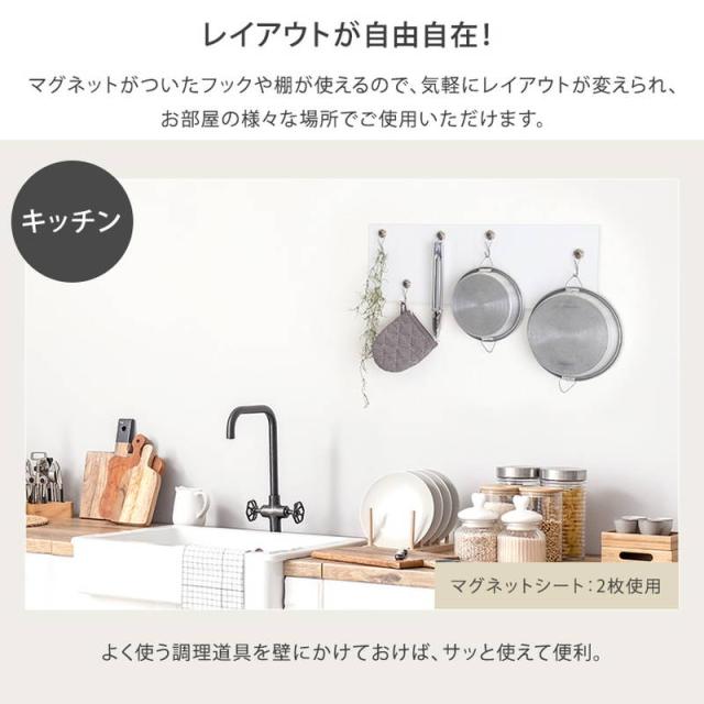 ●マグネットがついたフックや棚を使えるので移動が簡単かつ気軽にレイアウト変更も可能で、リビングや洗面所、キッチンなど様々な場所でご使用いただけます!