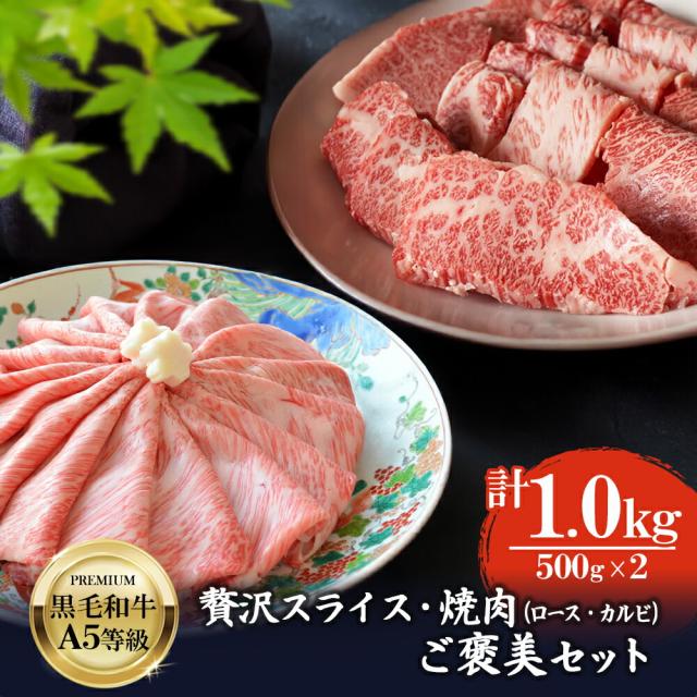 黒毛和牛 A5等級 贅沢 スライス & 焼肉 ( ロース & カルビ ) ごほうびセット 1kg (500g×2)【送料無料 お肉 ギフト 牛肉 すき焼き 和牛 しゃぶしゃぶ バラ BBQ 食べ比べ 肉 内祝い プレゼント お取り寄せグルメ 食べ物 お中元 お歳暮 御歳暮】