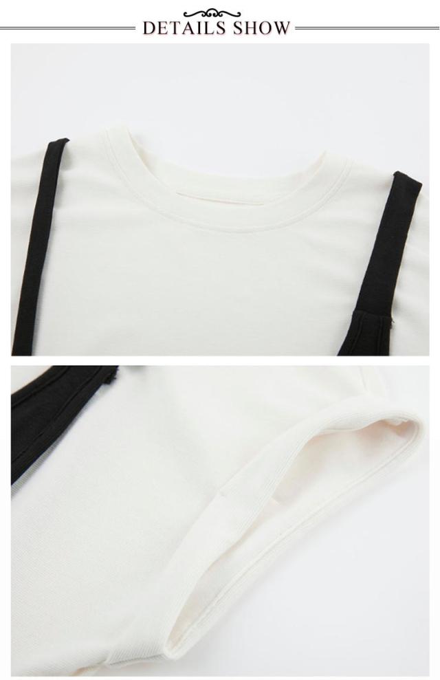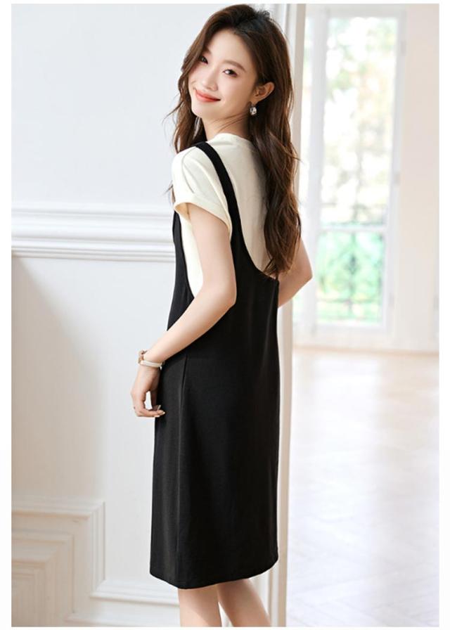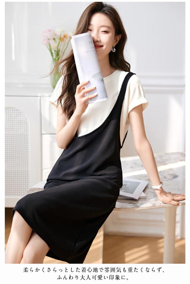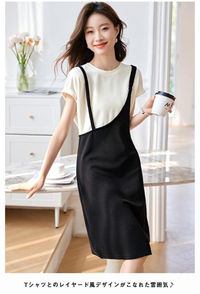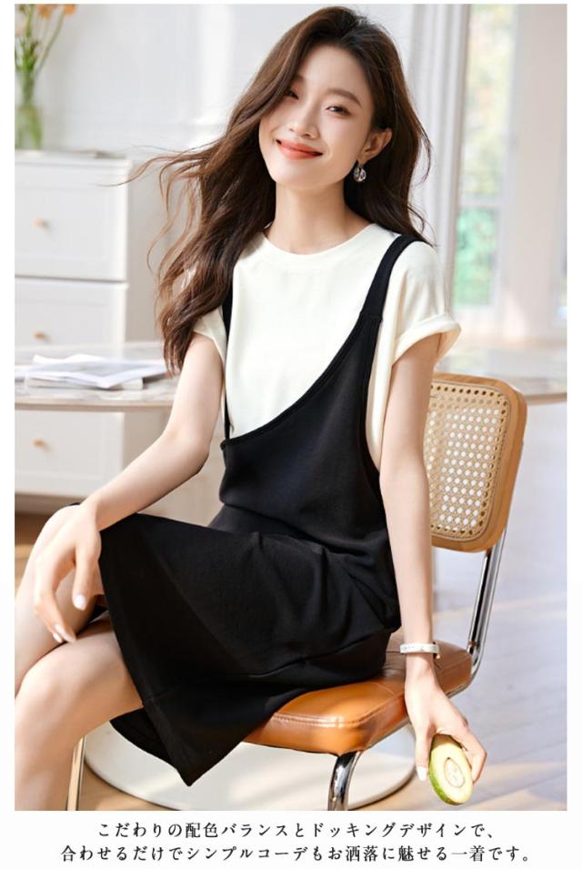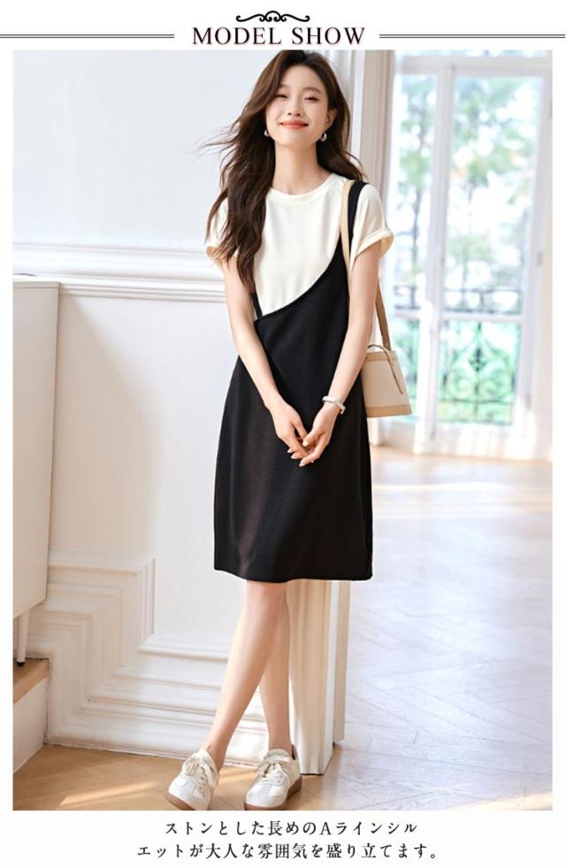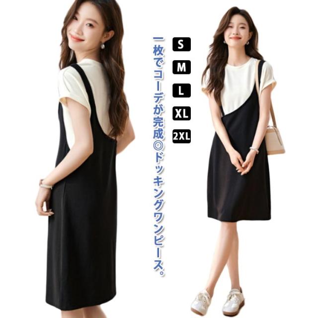 送料無料 ドッキングワンピース バイカラー 重ね着風 ジャンパースカート 半袖 ワンピース 夏 切り替え Tシャツ クルーネック チュニック レイヤード風 膝丈 Aライン シンプル 着痩せ 通勤 通学 可愛い