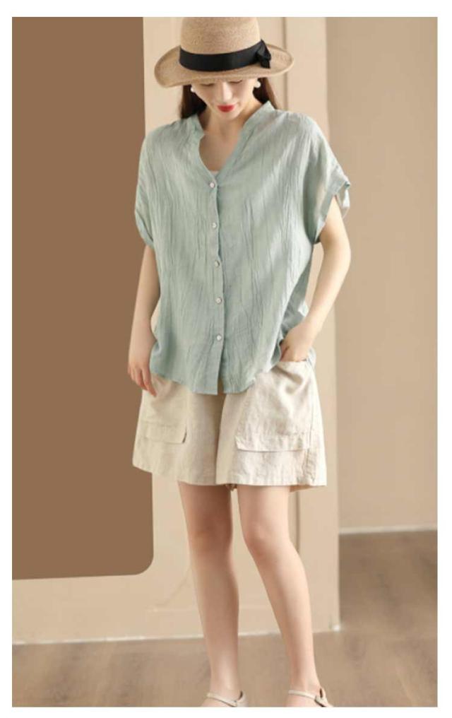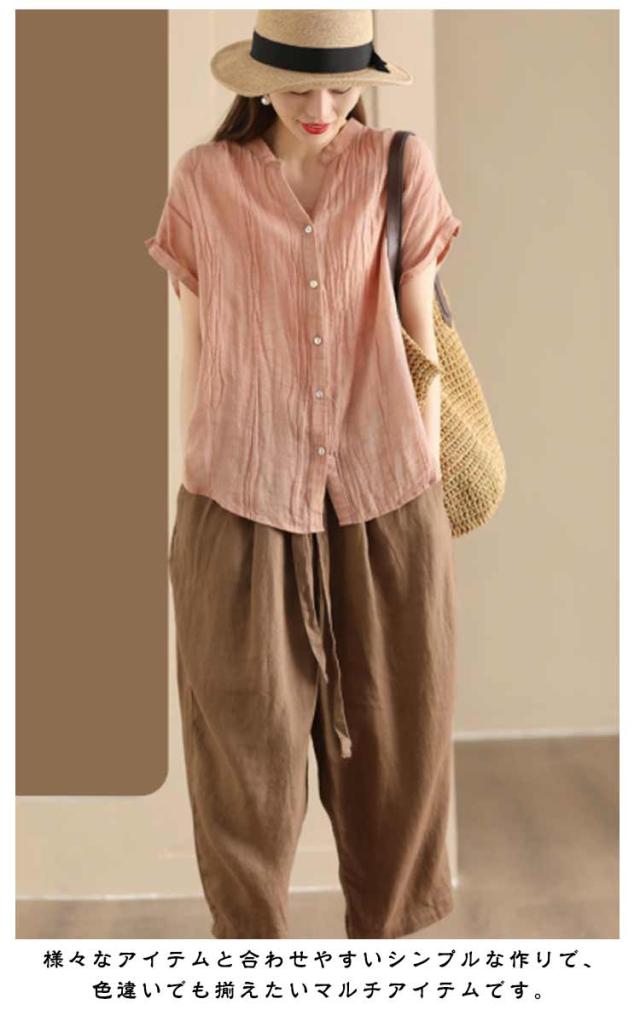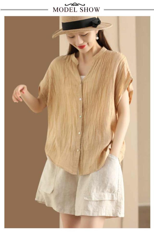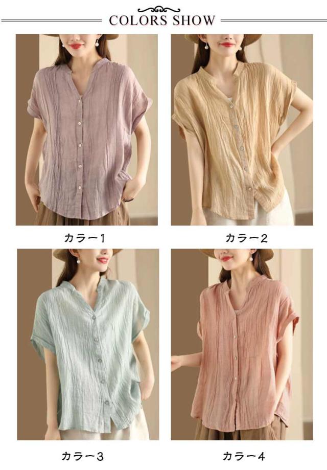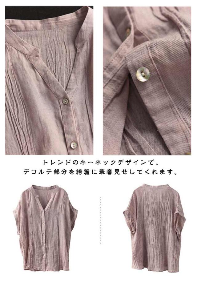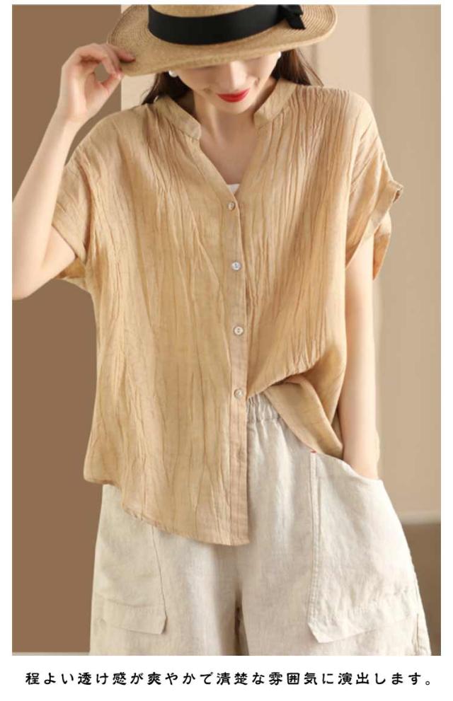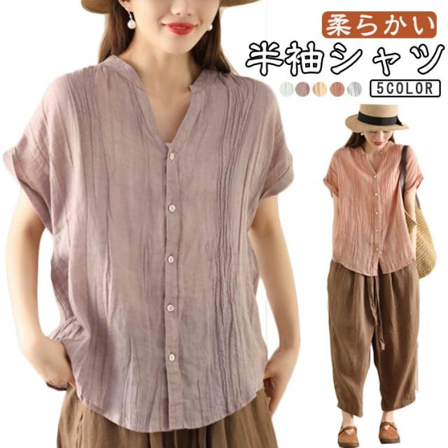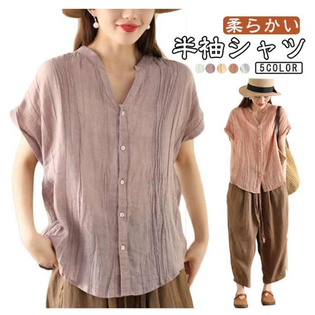 送料無料 シャツ 半袖 レディース キーネック ブラウス スタンドカラー トップス 半袖シャツ ノーカラー Vネック ガーゼブラウス シンプル 薄手 柔らかい ゆったり カジュアル 無地 おしゃれ