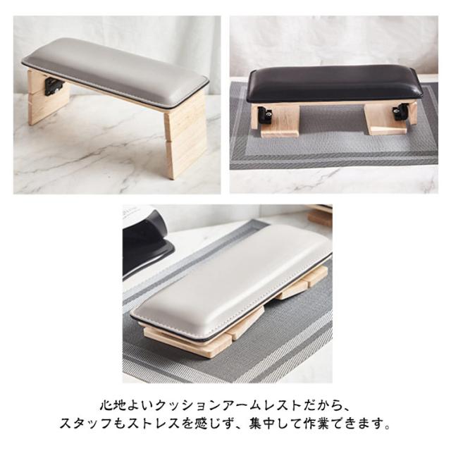 | 脚を折りたたむ事もできる。お客様が施術中疲れない設計のアームレスト。 心地よいクッションアームレストだから、スタッフもストレスを感じず、集中して作業できます。 ライトが収まる設計です。使いやすさにこだわり作りました。 防水加工がされているので濡れても安心、さっと一拭きでOK! | |