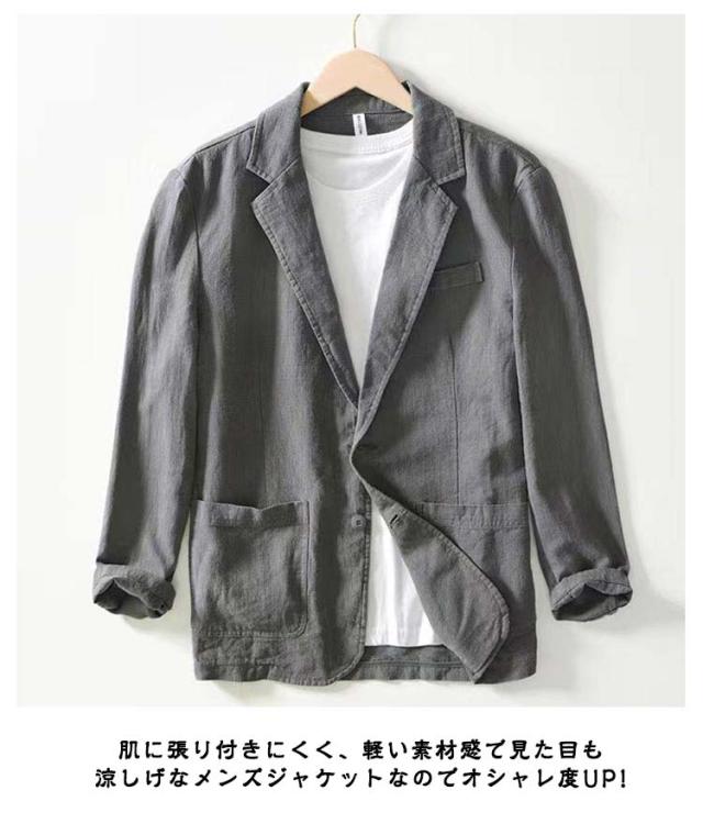 | 春夏定番で人気のある綿麻生地で仕上げた清涼感たっぷりのサマージャケット テーラードジャケットの襟がキレイに仕立てられており、大人の雰囲気が漂います。 素材は今季のトレンド感を踏襲した亜麻・綿(綿麻生地)を使用しておりますので、 軽くて通気性・吸水発散性に富んだ、ひんやりサラッとした肌触りの爽やかな着心地です。 肌に張り付きにくく、軽い素材感で見た目も涼しげなメンズジャケットなのでオシャレ度UP! | |