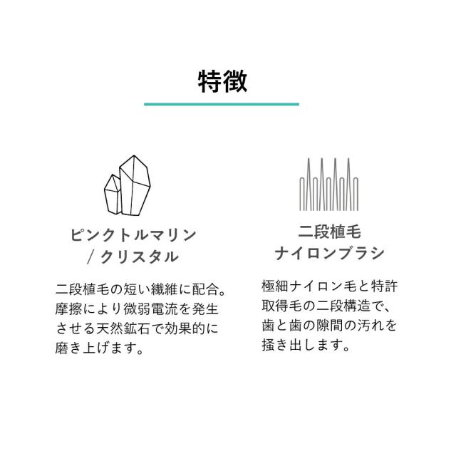 | 特許取得のブラシ繊維 この歯ブラシは、ピンクトルマリンと水晶の微粉末を練り込んだ特殊ナイロン繊維が使用されており、帯電性繊維として特許を取得されています。