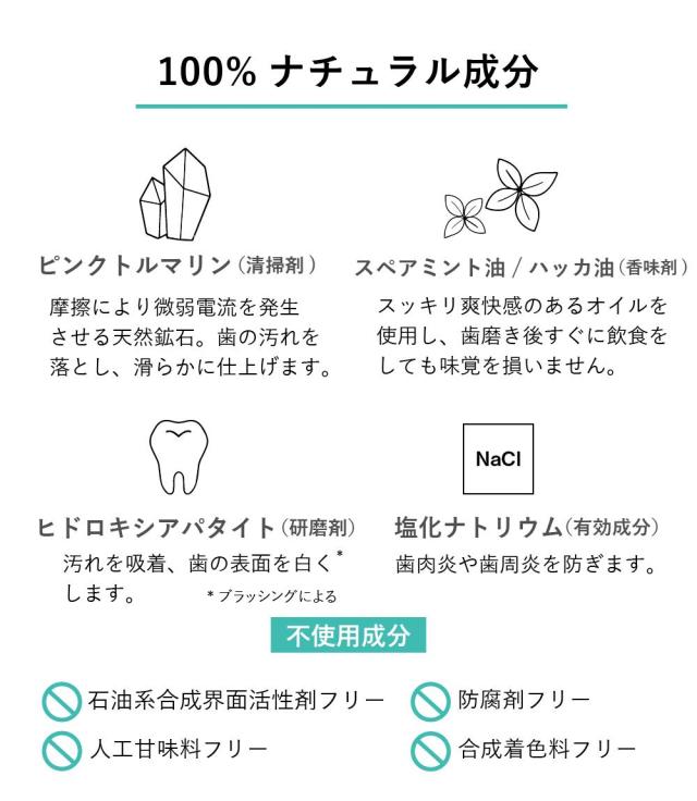 100%ナチュラル成分でしっかり磨きあげ、つるんと美しい歯へ。 天然鉱石ピンクトルマリン*1とヒドロキシアバタイト*2を配合した薬用歯みがき。