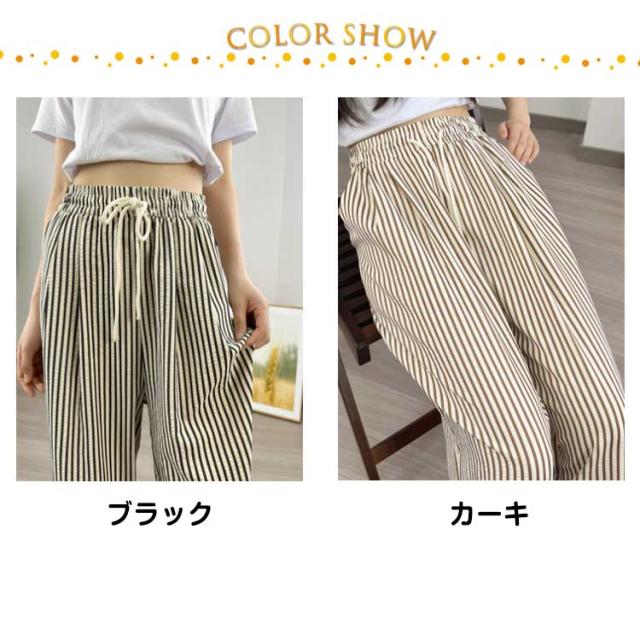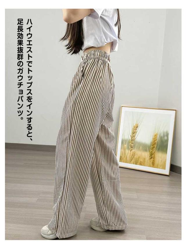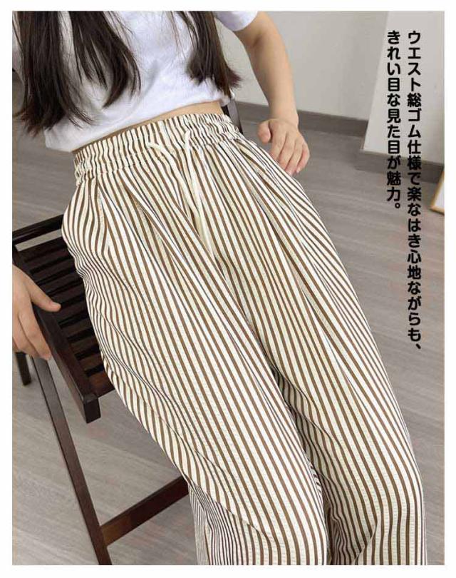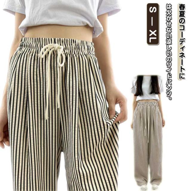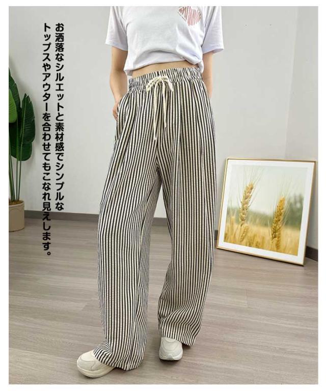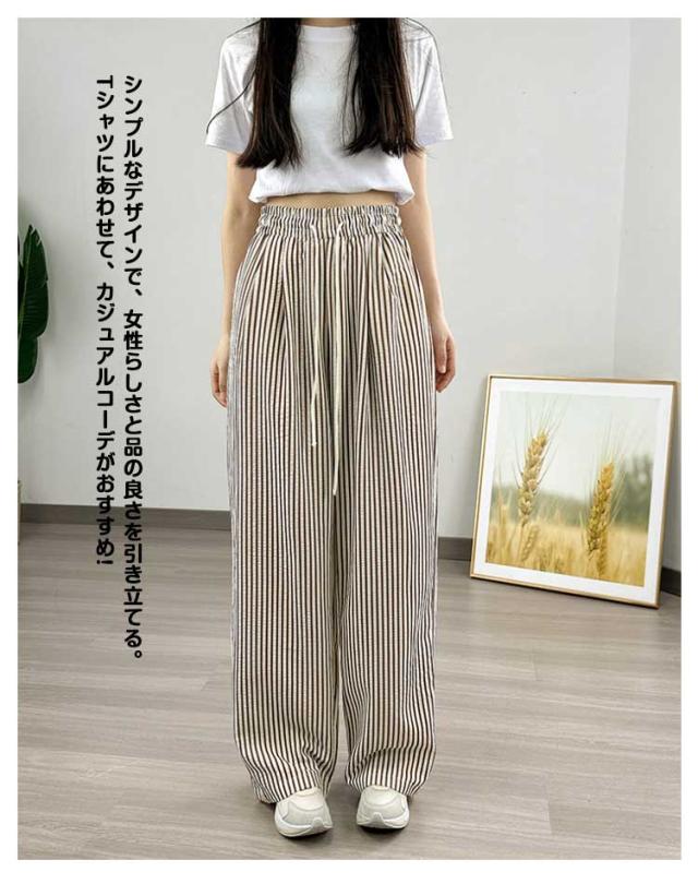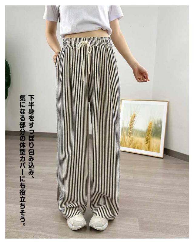 30代 ストレート 夏 ワイドパンツ ハイウエスト カジュアル レディース ストライプ柄 ウエストゴム ひも付き ワイド シンプル おしゃれ ゆったり 涼しい 快適 イージーパンツ 20代 ワイドパンツ 40代 50代