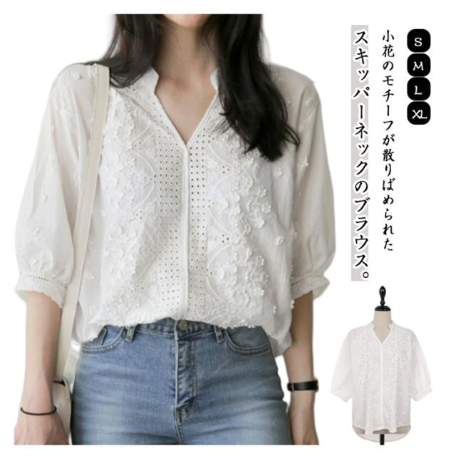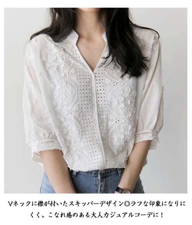スキッパーシャツ 刺繍 送料無料 チュニック 夏 ハンドカラー ブラウス シャツ スキッパートップス 春 レディース 送料無料 無地 ゆったり きれいめ 春 夏 上品 カジュアル オフィス