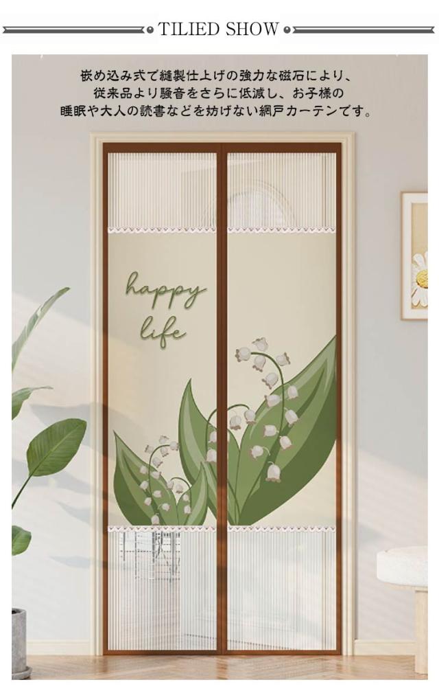 | おしゃれな花柄の玄関用網戸カーテン。【幅80/90/100/110cm】【長さ190−210cm】 嵌め込み式で縫製仕上げの強力な磁石により、従来品より騒音をさらに低減し、お子様の睡眠や大人の読書などを妨げない網戸カーテンです。 また、両手を開放し、荷物の運びなどにも便利、子供とペットでも簡単に通り抜けます。 中央の開閉部分は強力なマグネットが縫い付けられ、エッジが強化されまして、開ける瞬間には自動的にギャップなしで閉まります。 大人と幼児ちゃん、ワンちゃん、猫ちゃんもスムーズに通過できます。 網戸カーテンを開けた後、底に入れる重りで、自動的に元の位置に落ちて、ギャップなしで閉まります。 【高品質】従来の製品より網目が細かく、玄関などに設置して虫を二重防止し、夏でも風通しを快適に、省エネ効果も期待できます。 【空気循環】風が通る機能的な 空気循環を可能!虫を防ぎながら新鮮な空気が入ることを可能です。外の風景が見やすいように空間率を大きくしています。空気の流通にも邪魔しません。 【面ファスナー式】非常に強い接着剤&面ファスナーで、引き裂いても大丈夫です。 【取り付け簡単】木製や鉄製などドアの素材を選ばず、玄関、寝室、勝手口、ベランダなどに簡単に取り付けることができます。 【収納便利】使わないときは折り畳んで、コンパクトサイズ収納便利です。 | |