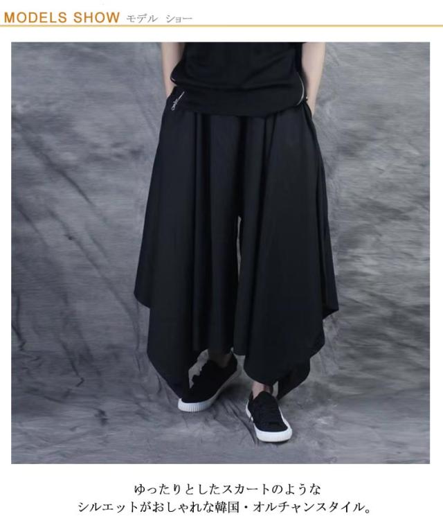 | オーバーサイズで存在感抜群の袴パンツです。 ゆったりとしたスカートのようなシルエットがおしゃれな韓国・オルチャンスタイル。 男女兼用:メンズ・レディース問わず誰でも着用していただけます。ペアコーデやカップルコーデにもおすすめです! ロック系はもちろん、エスニック系、スニーカーと合わせてストリート系、渋谷系、原宿系、スポーツミックス系など幅広いスタイルのアクセントに活躍します! 日常生活やレジャーシーンで幅広く活用でき、部屋着や寝間着としてもお勧めです。 | |