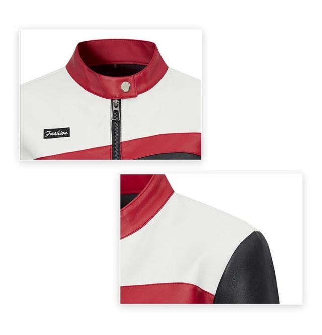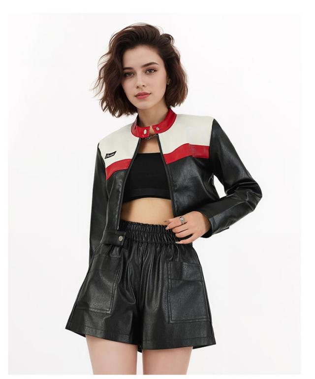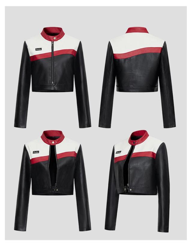 立ち襟 配色 スタンドカラー ショート丈 フェイレザー ジャケット レザージャケット ブルゾン ショートブルゾン レザージャケット 春 秋