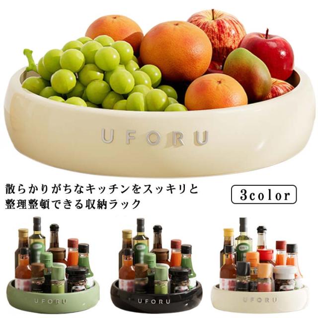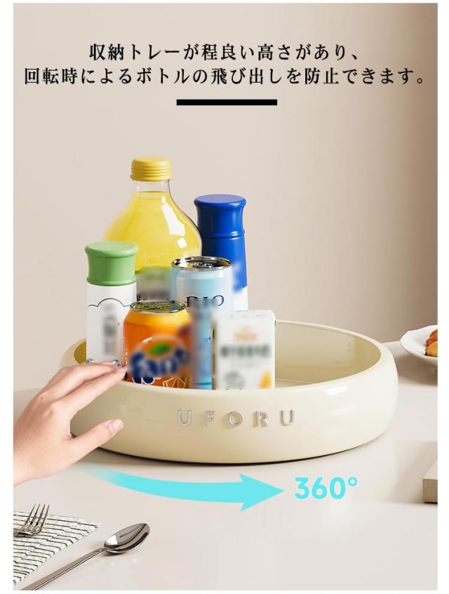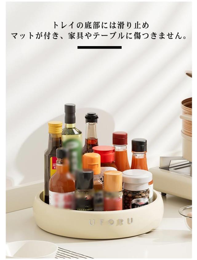 | 散らかりがちなキッチンをスッキリと整理整頓できる収納ラック 360度回転設計でどの方向からでも調味料が探しやすく取り出しも便利です。 トレイの底部には滑り止めマットが付き、家具やテーブルに傷つきません。 収納トレーが程良い高さがあり、回転時によるボトルの飛び出しを防止できます。 卓上収納、化粧品収納、キッチン収納、果物入れなどに最適です。 | |