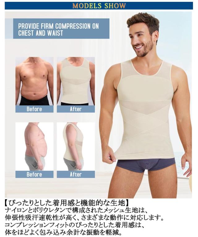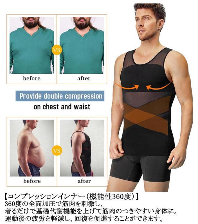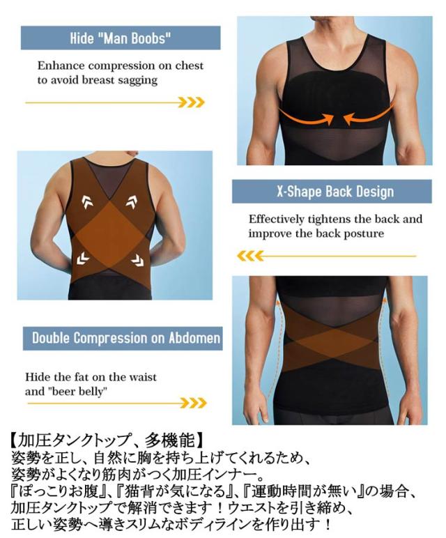 | 【ぴったりとした着用感と機能的な生地】ナイロンとポリウレタンで構成されたメッシュ生地は、伸張性吸汗速乾性が高く、さまざまな動作に対応します。コンプレッションフィットのぴったりとした着用感は、体をほどよく包み込み余計な振動を軽減。 【コンプレッションインナー(機能性360度)】360度の全面加圧で筋肉を刺激し、着るだけで基礎代謝機能を上げて筋肉のつきやすい身体に。運動後の疲労を軽減し、回復を促進することができます。 【優れストレッチ性が高い加圧シャツ】良く伸びるストレッチ素材で、激しい運動の際もパフォーマンスを妨げません。優れた伸縮性、ドライ加工により快適な着心地だから、普段着のインナー、トレーニング用のスポーツインナーとして着用がおすすめです! 【加圧タンクトップ、多機能】姿勢を正し、自然に胸を持ち上げてくれるため、姿勢がよくなり筋肉がつく加圧インナー。『ぽっこりお腹』、『猫背が気になる』、『運動時間が無い』の場合、加圧タンクトップで解消できます!ウエストを引き締め、正しい姿勢へ導きスリムなボディラインを作り出す! | |