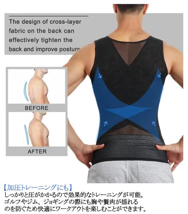 | 最強垂れ胸補正!! 加圧インナー 【着た瞬間、着やせ効果】運動してもなかなか結果が出ない、間に合わない。今日だけスリムに見せたい!そんな希望を叶える加圧インナーが出来ました! 補正インナーとしても、スポーツ時の加圧シャツとしても、姿勢を綺麗に見せる下着としてもマルチに使えるインナーアイテムです。 【乳首が浮かない】薄めのTシャツやニットを着用した際の乳首浮き、透けをパワーネットがしっかりガード!!自然なフラットなシルエットに見せられるので、いつものお洋服のインナーに使うだけで一気にスタイリッシュなルックスに仕上がります。 ニップレスなど貼り付けるものは手間がかかりコスパもかかりますが、このインナーがあれば今まで諦めていたファッションにもトライできます。 【下腹部も引き締める】エックスラインのストレッチ補正ベルトが気になる下腹部もしっかりと抑え込みます。背中側にもクロスラインの補正ベルトを施し 同時に猫背も補正。きれいな姿勢を保ち、自信あふれる印象に。毎日着用する事で正しい姿勢も身につきます。 【加圧トレーニングにも】しっかりと圧がかかるので効果的なトレーニングが可能。ゴルフやジム、 ジョギングの際にも胸や贅肉が揺れるのを防ぐため快適にワークアウトを楽しむことができます。 【苦しいだけのインナーはもう卒業 】通気性のいいメッシュ生地で長時間の着用も蒸れにくく、汗も乾きやすい。細やかなパワーネットは優れたストレッチ性を発揮するので 補正はしつつ窮屈感を抑えたストレスフリーな造りになっています。服の下でも目立たず、自然なカバーレイヤーのため、普段の会社でのインナーとしてもおすすめです。 ※楽に着用する方法 生地を傷めず長くご使用いただくためにも、下から履くように着用し、片手ずつ腕をアームホールよりお出しください。 | |