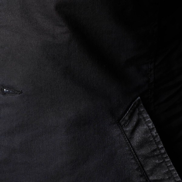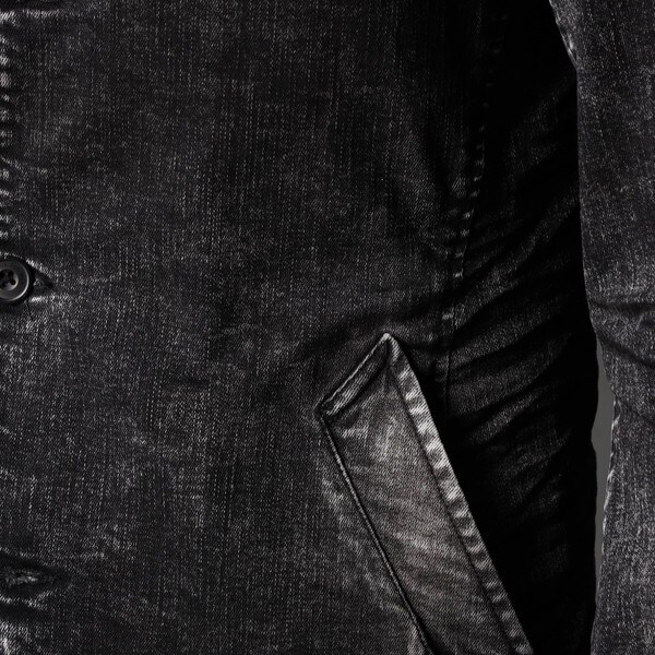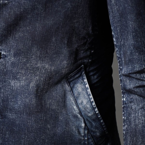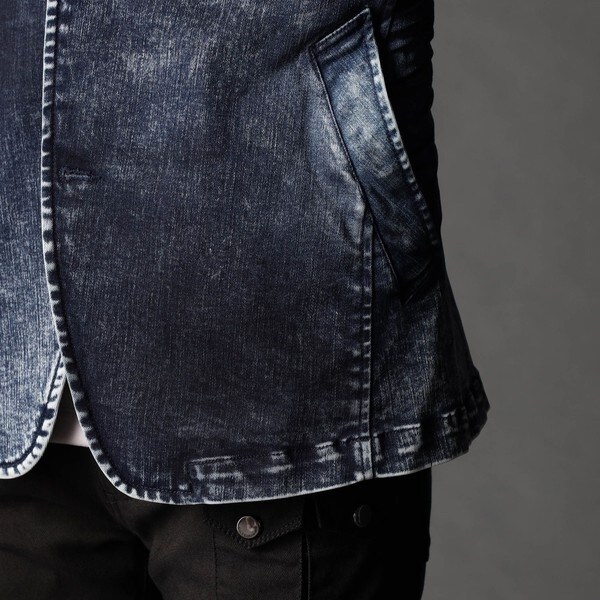 最終の製品加工を岡山のデニム専門の加工所(Wellsウェルズ)に依頼。中国で先に古着風のユーズド加工を施したベース製品を作り、全体のサイズを縮率調整してから国内にて最終加工を施しています。手作業でリアルな3Dシワ加工を施して形状を固定、更に陰影感が出る様に顔料を薄っすら部分的に吹き付けています。身頃にも軽く顔料を吹き付けてムラ感を出しています。