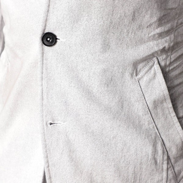 スタンド・イタリアンカラーのカヴァーオールジャケット。裏地無しの一重仕様です。衿は折り返してもラペルとして綺麗に収まる設定、タブで釦止めが出来ます。フロントの一番下の釦は止める設定していませんのでご注意ください。迷彩柄ジャカード裏地を使用してアクセントにしています。