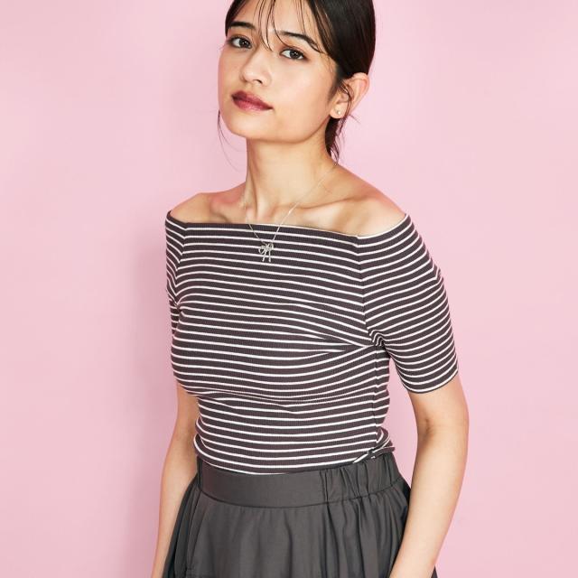 程よい肉感で安心感のあるボーダー柄のテレコ素材を使用しているオフショルダープルオーバーです。