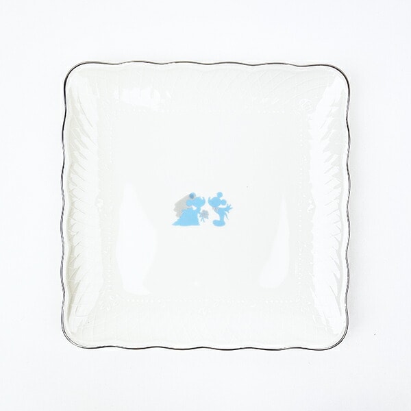 ホワイトにミッキー達のブルーのシルエット、シルバーの縁取りがとてもオシャレ。お皿や小物トレーとしておすすめです。ギフトにも◎