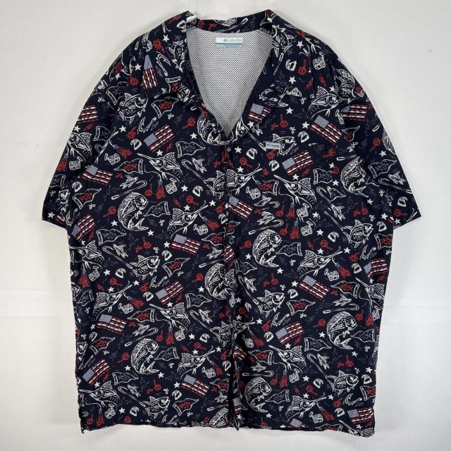 古着 コロンビア Columbia 半袖シャツ PFG フィッシングギア イラスト 魚 ルアー 星条旗 タカ L ネイビー 総柄 メンズ