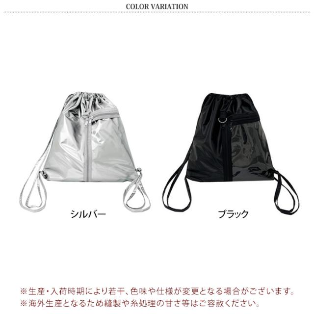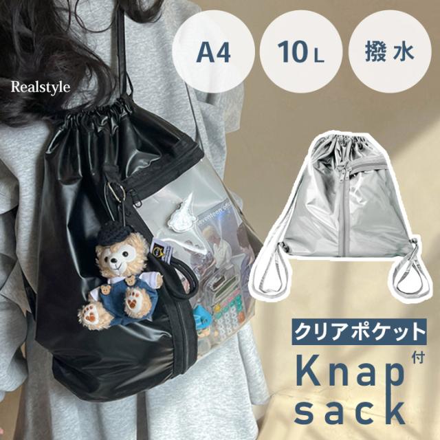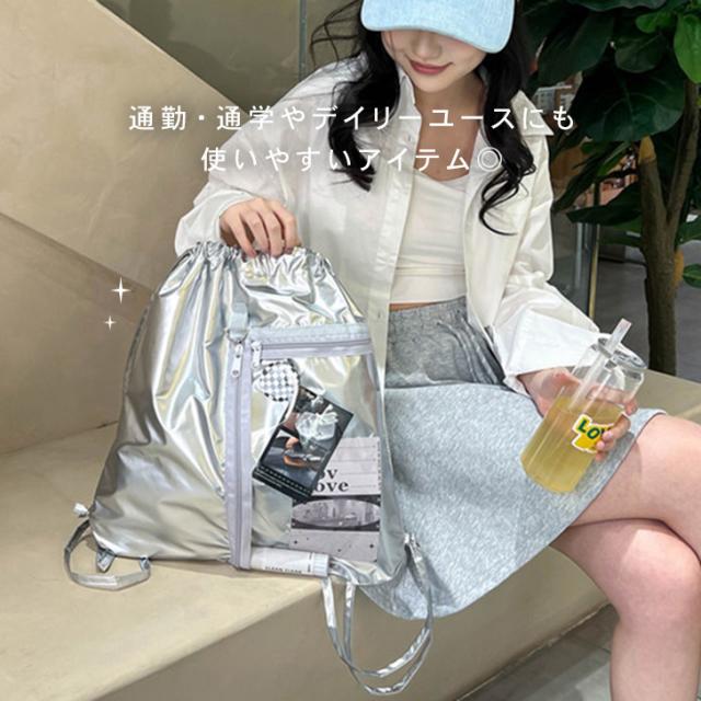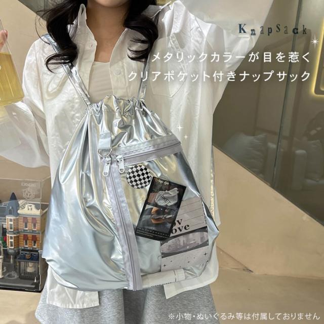 メタリックカラーが目を惹くクリアポケット付きナップサック