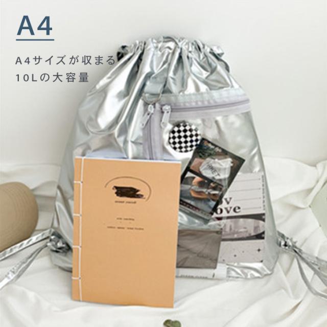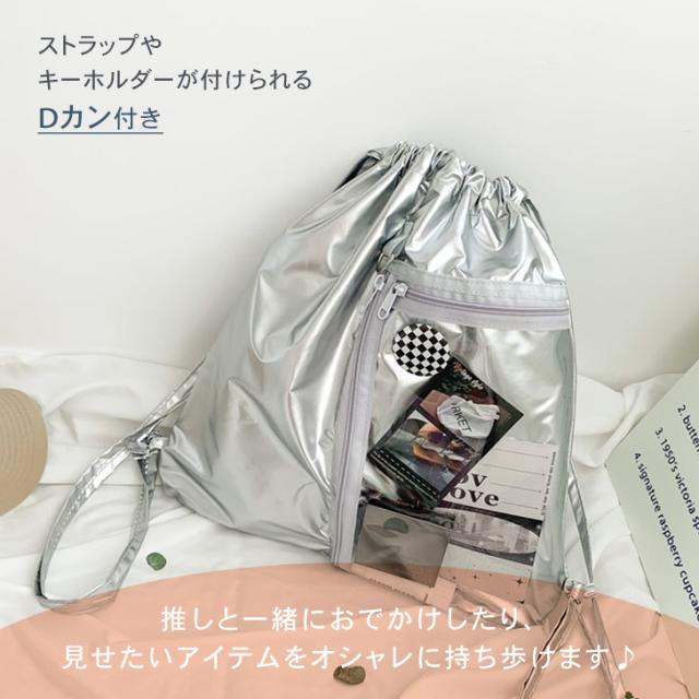 クリアポケット付き10L撥水メタリックナップサック レディース ナップザック リュック 痛バッグ 痛バ 軽量 a4 大きめ 大容量 10L 推し活 ライブ コンサート 推し活グッズ 通勤 通学 おしゃれ 可愛い リュックサック 巾着 クリアバッグ 推し活バッグ クリア 透明 オタク オタ活 アイドル アニメ チェキ ぬいぐるみ 缶バッジ バッチ メタリック かわいい 韓国 巾着バッグ 上品 軽い はっ水 A4 大きい フェス グッズ 旅行 シンプル ヲタ活 トレーディングカード トレカ 写真 保管 保存 バッグアクセサリー ポケット ぬいバッグ ぬいば ぬいバ ぬいポーチ ぬいぐるみバッグ ちびぬい チビぬい アクリルスタンド アクスタ ペンライト ペンラ 推し入れ 推し ストラップ キーホルダー 見せバッグ 魅せバッグ 中が見える ザック デイパック バックパック スポーツバッグ ジムサック ジムバッグサブバッグ バッグ バック かばん 鞄 カバン 小物入れ 自転車 会社 オフィス ビジネス 出張 学生 中学校 中学生 高校 高校生 大学 学校 遠征 遠足 修学旅行 キャンプ アウトドア レジャー BBQ バーベキュー 釣り フィッシング 登山 山登り ハイキング ピクニック 公園 散歩 お散歩 屋外 野外 作業 フェス イベント 海水浴 海 ビーチ 砂浜 川 運動 スポーツ ヨガ フィットネス 温泉 銭湯 お風呂 サウナ お洒落 オシャレ カワイイ フレンチガーリー ベーシック 無地 北欧 海外 きれいめ フェミニン 女性 女子 女の子 春 夏 秋 冬 春夏 秋冬 通年 オールシーズン デイリー 普段使い 買い物 ショッピング トラベル プレゼント ギフト 贈り物 10代 20代 30代 40代 50代 シルバー 銀 ブラック 黒
