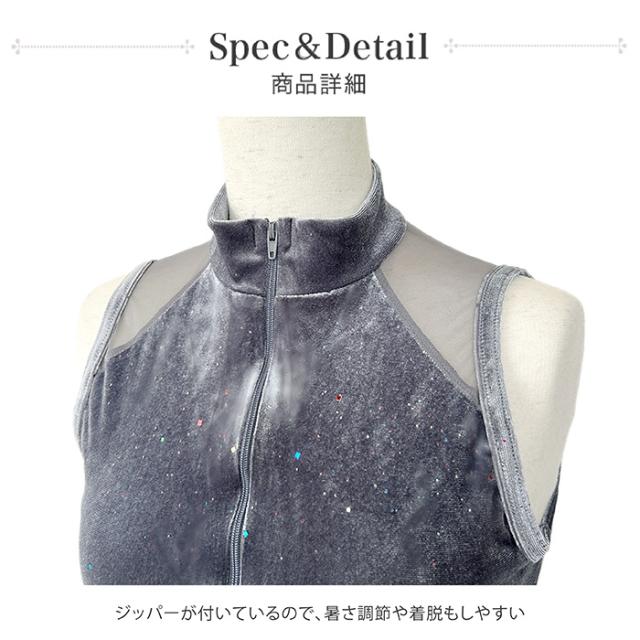 肩と背中部分に、伸縮性に優れたメッシュ生地をあしらい、ベロアの重たい印象をスッキリとおしゃれな雰囲気に。