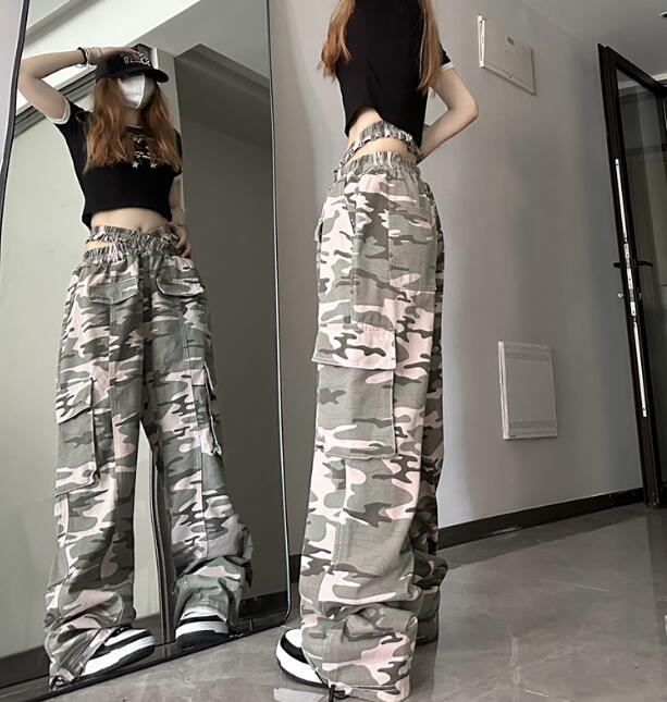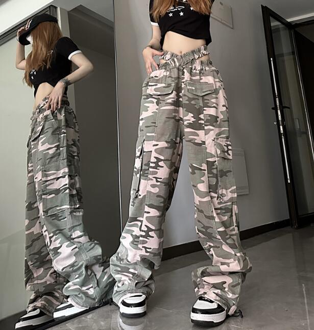 迷彩ミリタリーワイドカーゴパンツズボンボトムスパンツハイウエストゴム絞りロングジョガーパンツシンプル大きいサイズゆったりだぼだぼダンス衣装ヒップホップHIPHOPレディースメンズストリート奇抜派手