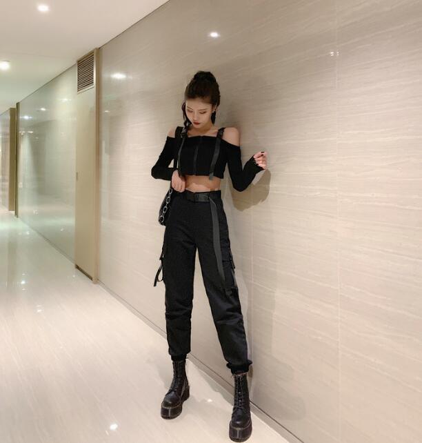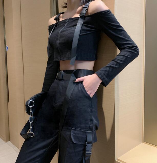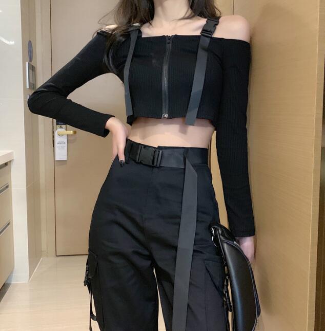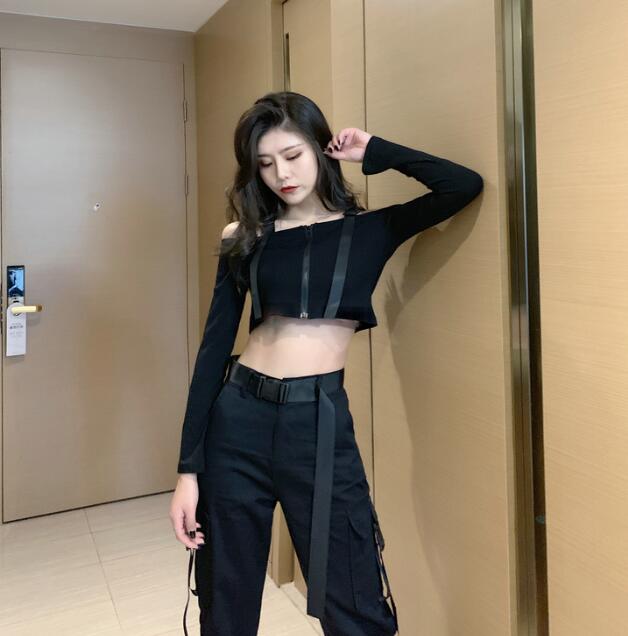トップスカットソータンクトップ長袖ショート丈 短め短いベルトtシャツ レディースガールズストリートレディースファッション Tシャツ カットソー トップス