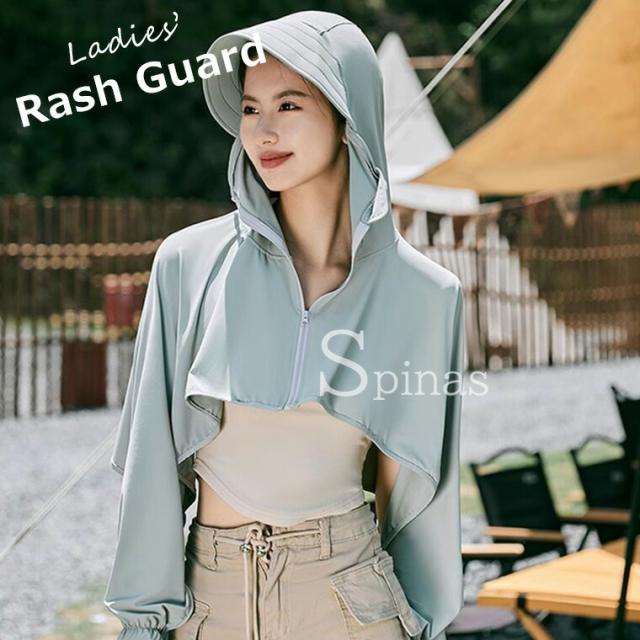 つば広いフードで首や顔まで守れる ♪6色展開 レディース UVカットケープ 肩掛けラッシュガード 長袖 アウター フード付き 手袋付き ショート丈 クロップド丈 UV帽子 自転車 蚊 防虫 UVケア