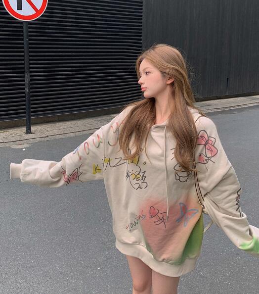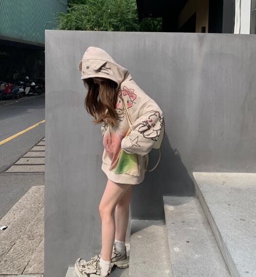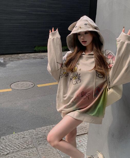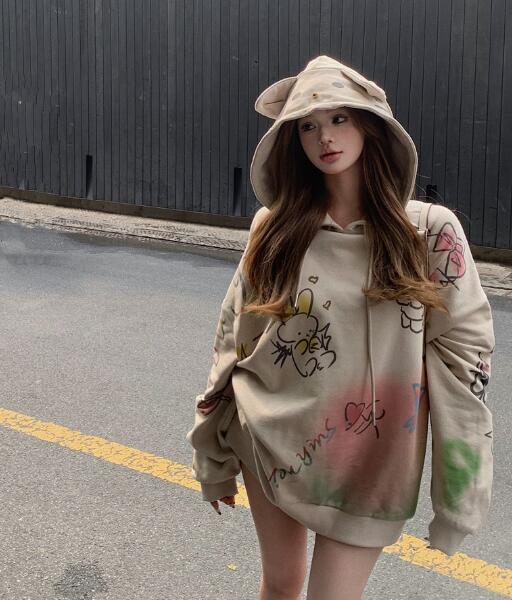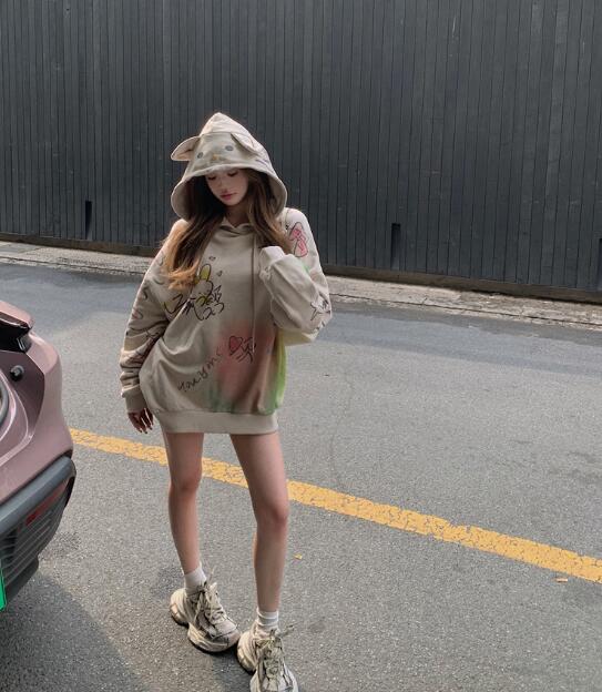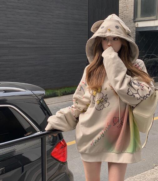 耳付きかわいいパーカーフーディー長袖トップスカットソートレーナーフード裏起毛ビッグ大きいサイズゆったり長めダンス衣装ヒップホップHIPHOPレディースガールズストリート韓国おしゃれ奇抜派手大人