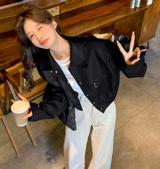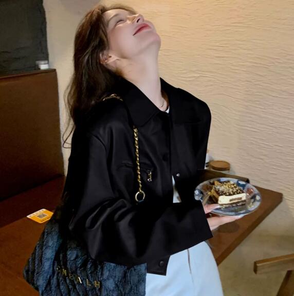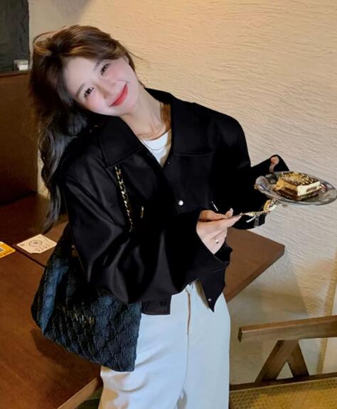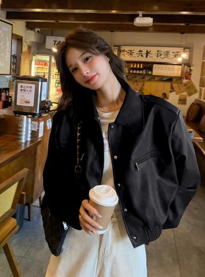 スタジャンベースボールジャケット韓国系ファッション アウターブルゾンジャケットジャンパーシンプル黒ブラックレザービッグ大きいサイズヒップホップHIPHOPレディース ガールズ