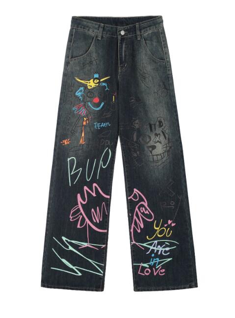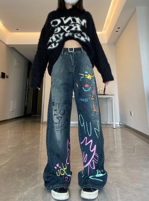 デニムズボンボトムスパンツジーンズジーパンストレート落書きカラフルプリントシンプルダンス衣装ヒップホップHIPHOPレディースガールズストリート奇抜派手韓国ビッグ大きいサイズ