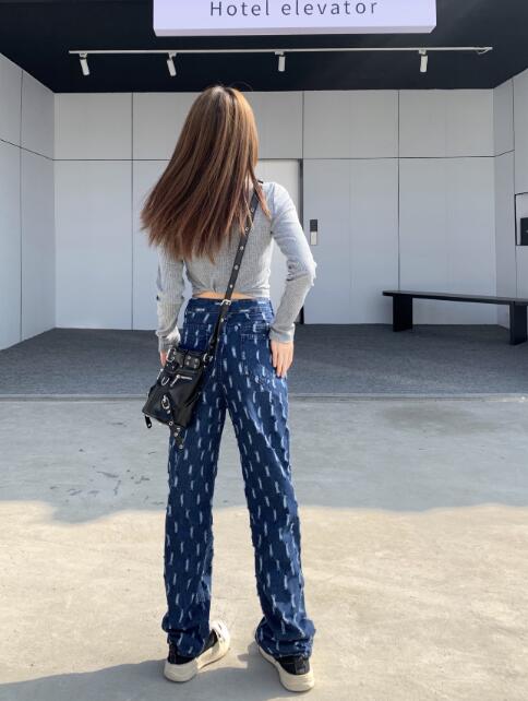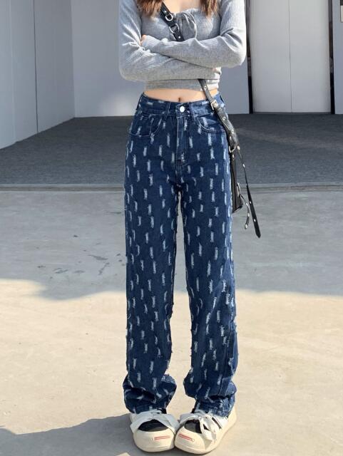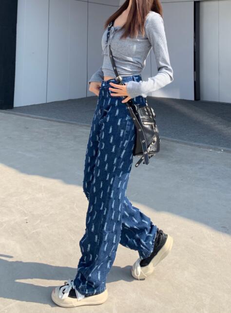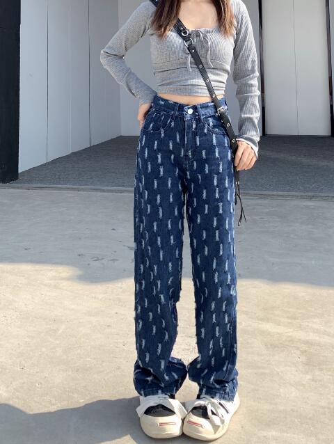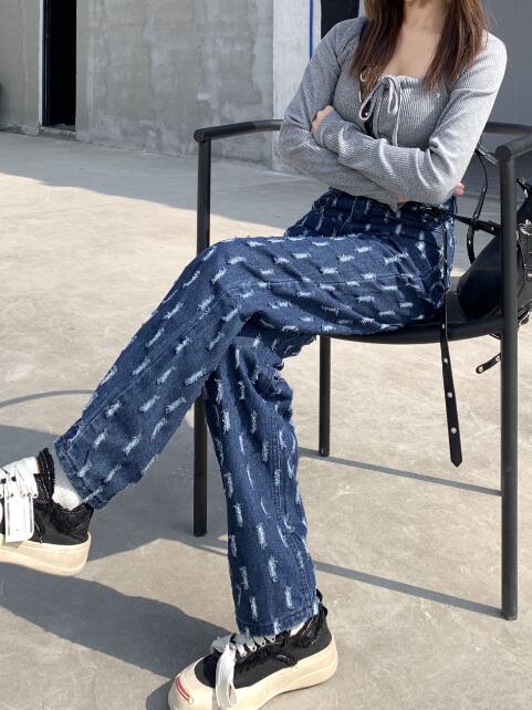 デニムズボンボトムスパンツジーンズジーパンストレートダメージシンプルダンス衣装ヒップホップHIPHOPレディースガールズストリート奇抜派手韓国ビッグ大きいサイズ