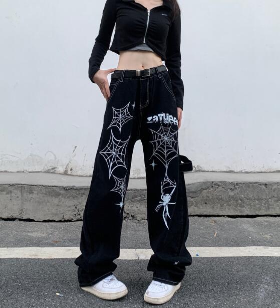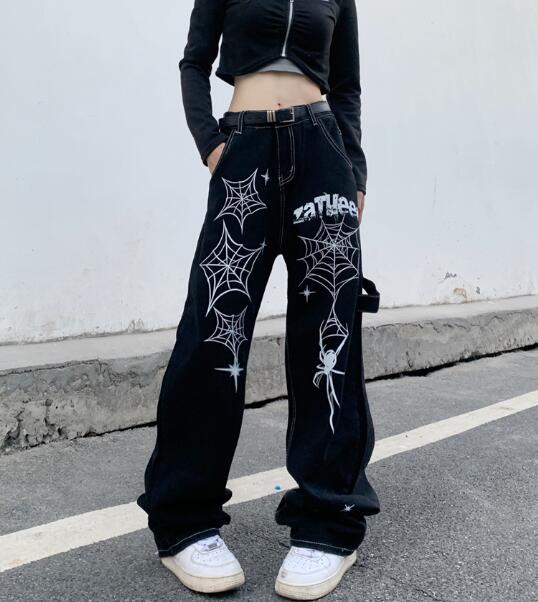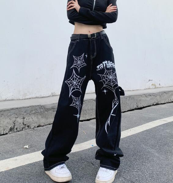 くもプリントデニムズボンボトムスパンツジーンズジーパンストレートロングハイウエストシンプルダンス衣装ヒップホップHIPHOPレディースガールズストリート奇抜派手韓国ビッグ大きいサイズ