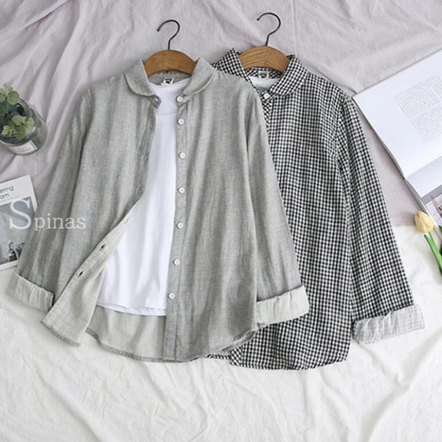 個性的で可愛らしい印象をつくる 丸襟ブラウス シャツ 長袖ブラウス シャツブラウス レディース ギンガムチェック 無地 シンプル ギンガム