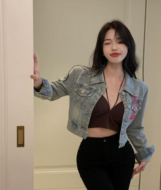 ショート丈ジージャンデニムジャケット短いへそ出し長袖Gジャン青シンプルボタンポケットバックプリントビッグ大きいサイズダンス衣装ヒップホップHIPHOPレディースガールズ大人ストリートアウタージャンパー