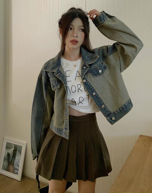 ショート丈ジージャンデニムジャケット短い長袖Gジャン青シンプルボタンビッグ大きいサイズダンス衣装ヒップホップHIPHOPレディースガールズ大人ストリートアウタージャンパー韓国