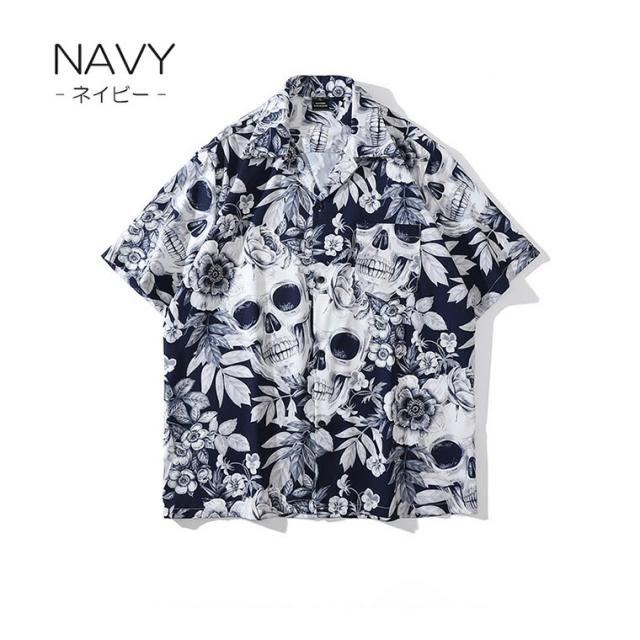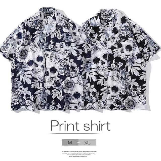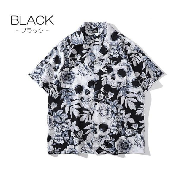 シンプルになりがちな夏コーデのアクセントになる メンズ 総柄 開襟シャツ カジュアルシャツ プリント シャツ ゆったり 半袖 骸骨プリント スカル ストリート 個性的 アロハシャツ モード系