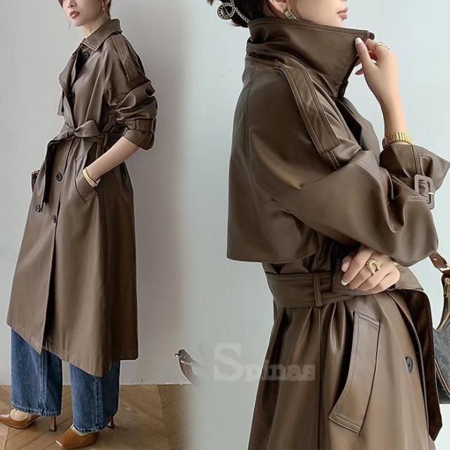洗練されたモードなトレンチ フェイクレザー PU レディース トレンチコート ロングコート ジャケット 合成皮革 アウター PUコート ベルト付き