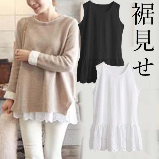2XLサイズまで 大人の上品な裾見せ スカラップ タンクトップ スカラップレース ロング丈タンクトップ レイヤード風 レディース フェイクレイヤード 重ね着スタイル 付け裾